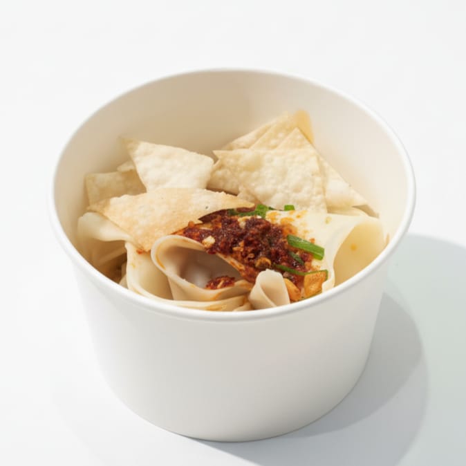 Pangsit lembut dengan isian daging ayam premium, disajikan dengan chili oil khas Dapoer Alit yang pedas, gurih, dan beraroma rempah. Lengkap dengan kerupuk pangsit renyah untuk tekstur yang sempurna.